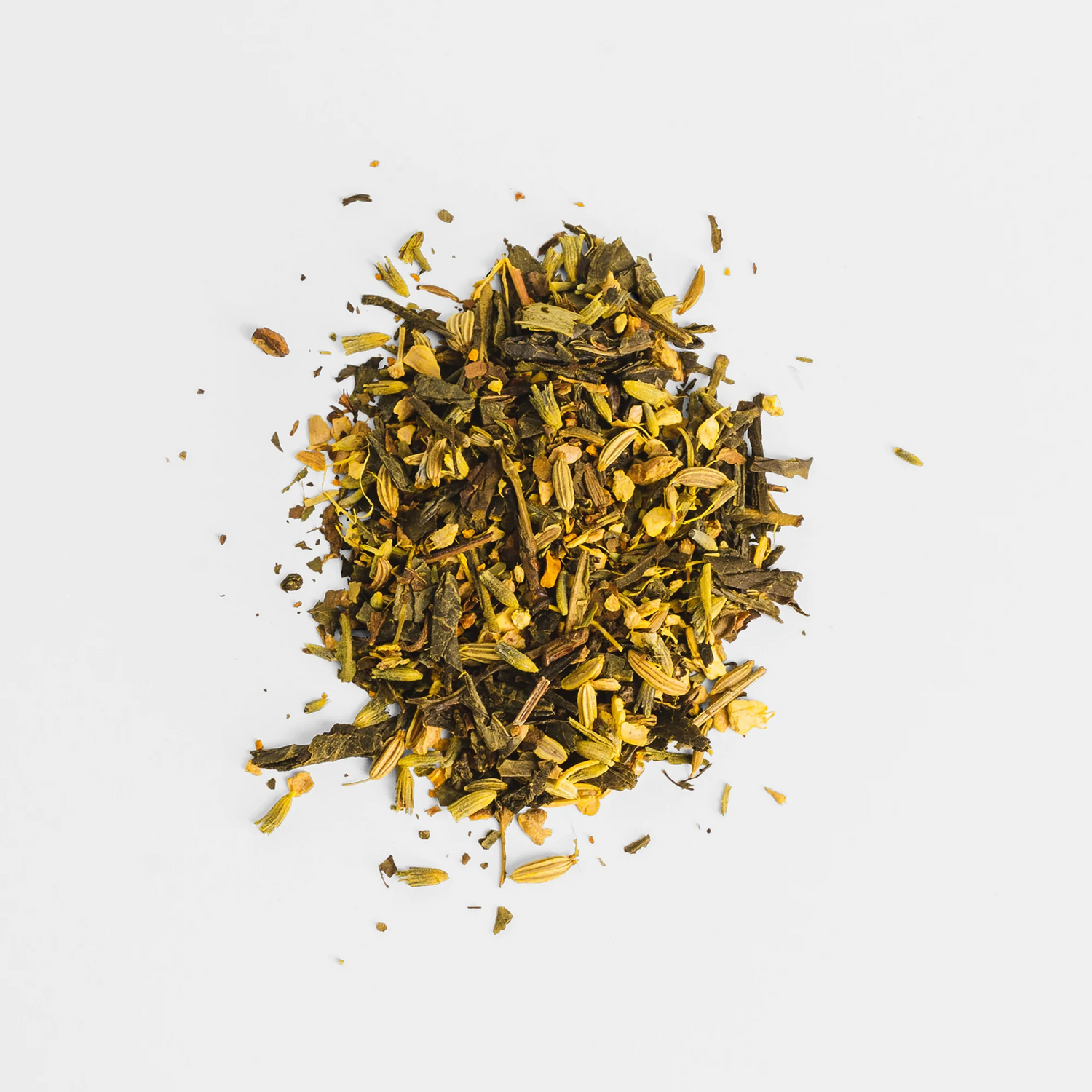 Sencha Green Tea: Rich in antioxidants, supports metabolism and energy levels. Ginger Root: Known for its digestive properties. Fennel Seed: Aids digestion and helps manage bloating. Dandelion Root: Supports liver health and detoxification. Tulsi Leaf: Helps manage stress and promotes relaxation. Turmeric Root: Healthy inflammatory response and antioxidant properties.